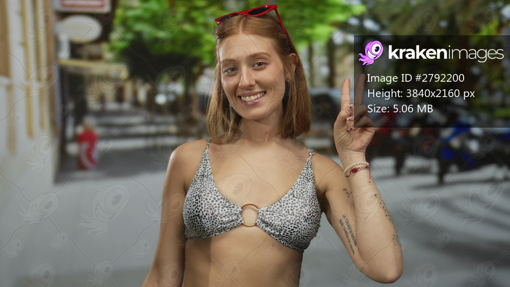 Woman smiling in bikini on urban street with sunglasses and tattoos, making peace sign with nature background and colorful accessories.
