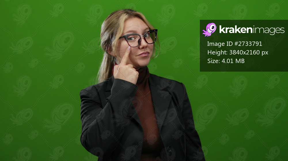 Woman smiling in black blazer pointing to eye with glasses over green background, showcasing confidence and positivity in a studio setting with vibrant colors. - Kraken Images