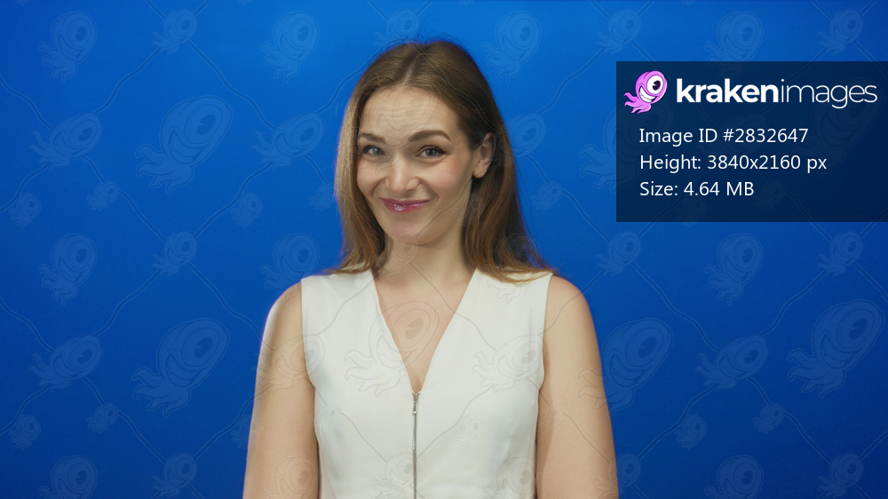 Woman smiling in bright blue studio wearing white top with relaxed posture and genuine grin toward lens; happiness.