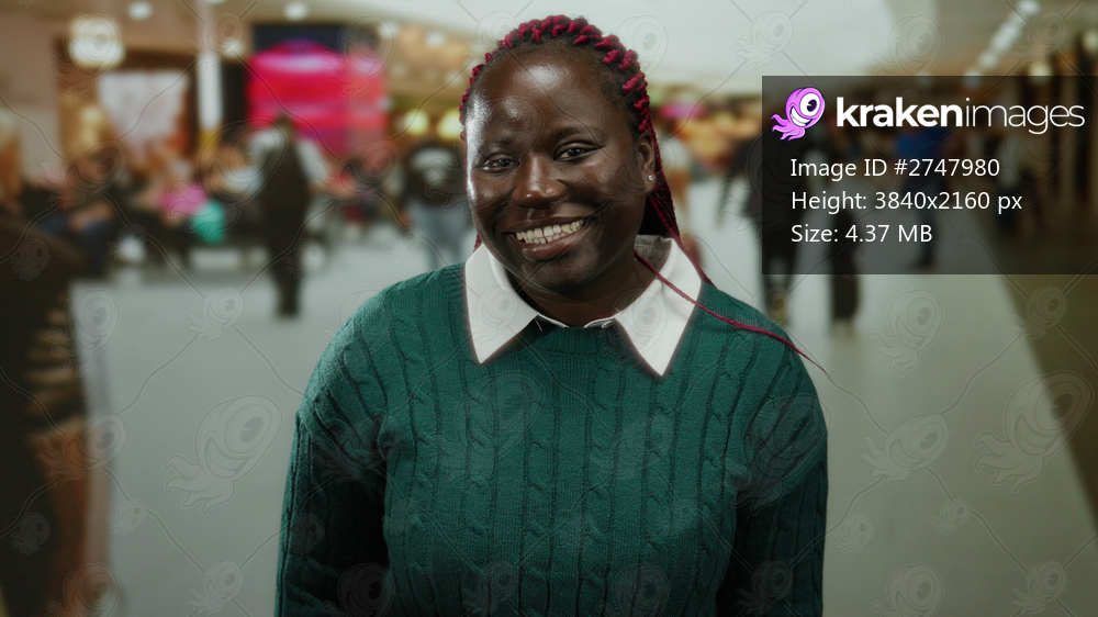 Woman smiling in busy airport terminal, indoor setting creates bustling atmosphere, casual attire suggests travel comfort, diverse crowd in background enhances travel theme.
