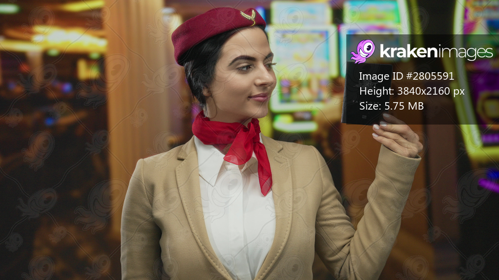 Woman smiling in casino holding australian passport wearing flight attendant uniform signifying travel excitement indoors.