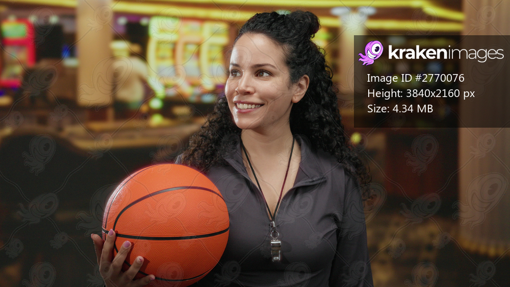 Woman smiling in casino interior holding basketball next to slot machines showcasing a vibrant indoor scene.