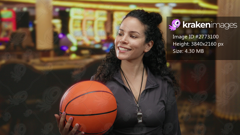 Woman smiling in casino interior holding basketball next to slot machines showcasing a vibrant indoor scene.