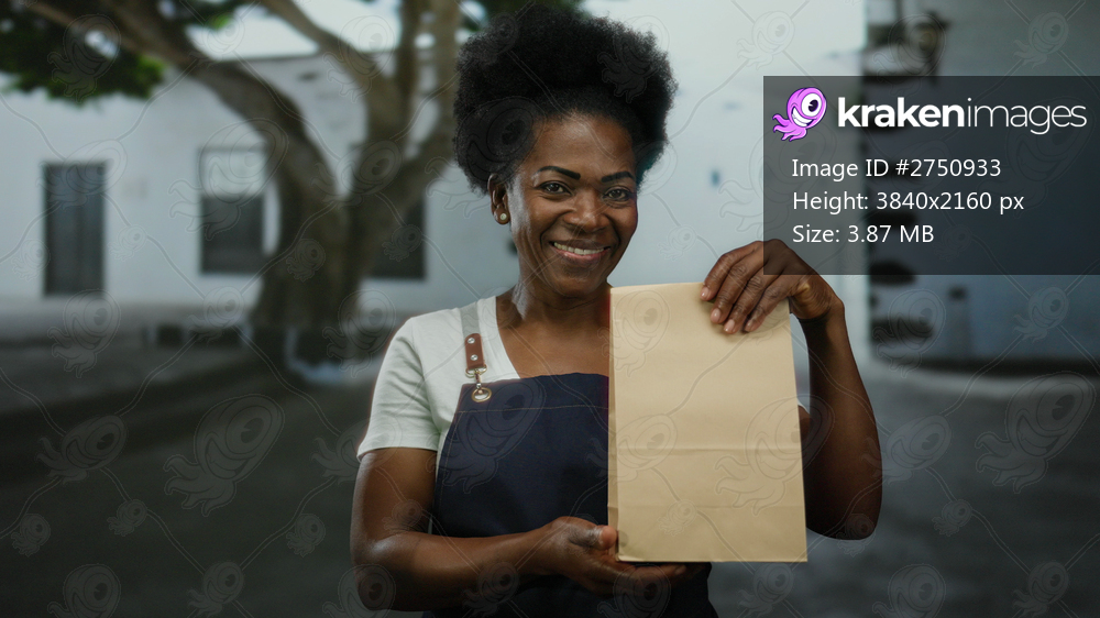 Woman smiling in city street holding paper bag wearing apron symbolizing urban takeaway experience.
