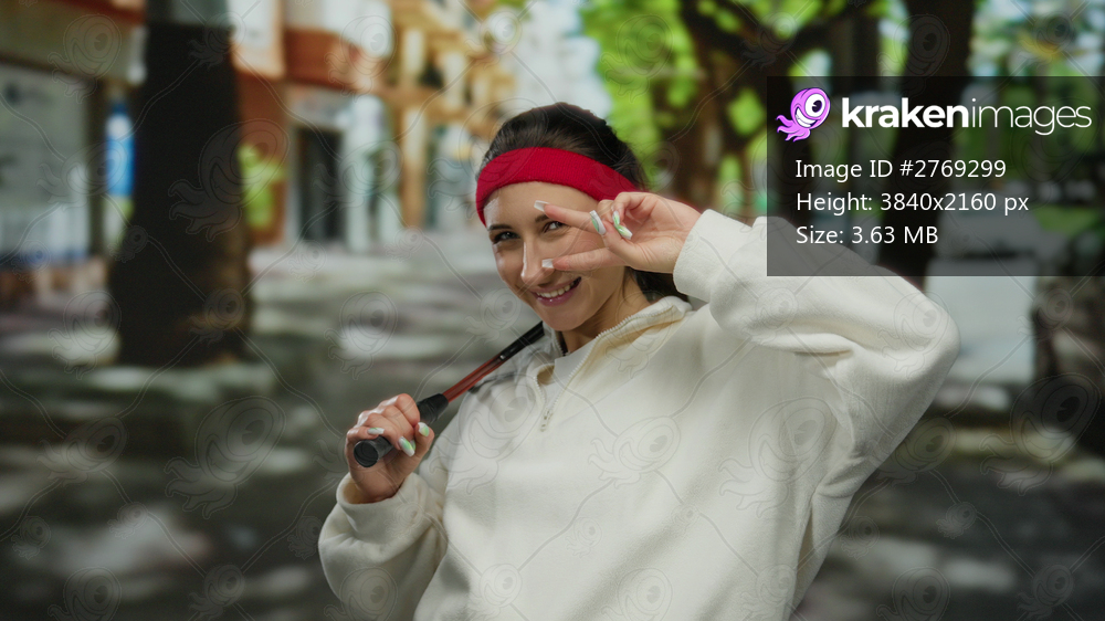 Woman smiling in city street holding tennis racket making peace gesture wearing white sweater and red headband outdoors surrounded by urban landscape.