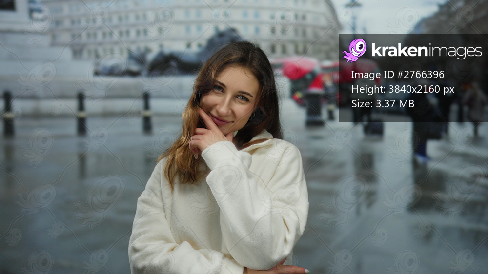 Woman smiling in city street on rainy day with iconic red bus and building in background showcasing urban lifestyle with cheerful feeling