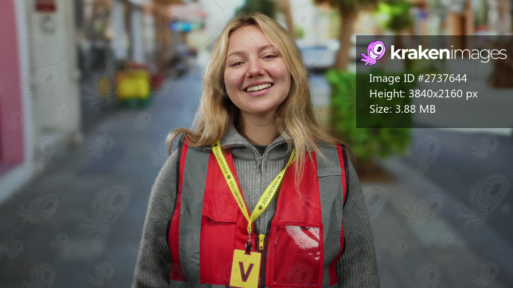 Woman smiling in city street wearing red volunteer vest outdoors showing joy and commitment to service among urban scenery.