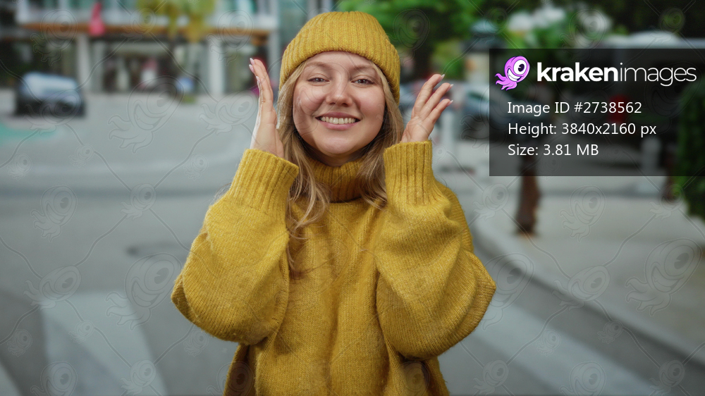 Woman smiling in city street wearing yellow sweater and hat, displaying cheerful expression outdoors in an urban environment, vehicle in background, representing joy and warmth. - Kraken Images