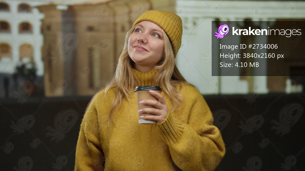 Woman smiling in city wearing yellow sweater and beanie holding coffee cup enjoying outdoor street scene.