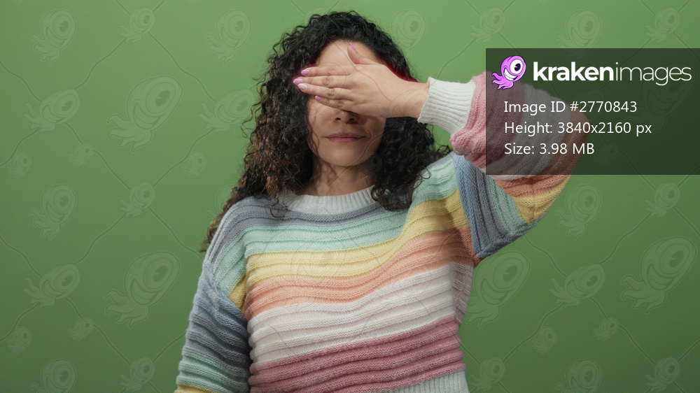 Woman smiling in colorful sweater covering eyes with hand against green background expresses playfulness and warmth