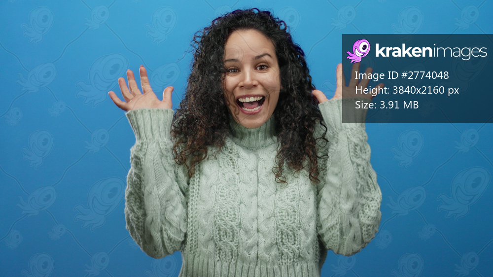 Woman smiling in cozy sweater against vibrant blue background expressing happiness isolated in studio setting