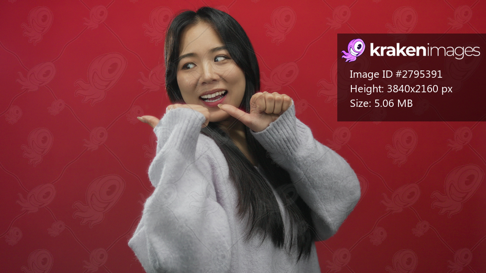 Woman smiling in cozy sweater with long hair, playfully pointing thumbs towards herself on vibrant red background, conveys cheerful and lively demeanor. - Kraken Images