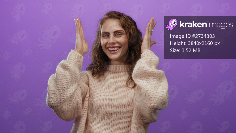 Woman smiling in cozy sweater makes framing gesture against vibrant purple background, expressing creativity and joy.