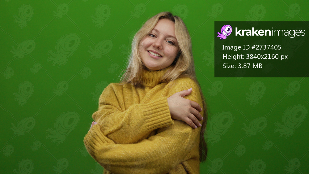Woman smiling in cozy yellow sweater hugging herself against a vibrant green wall, exuding warmth and comfort through her gentle expression and relaxed posture. - Kraken Images