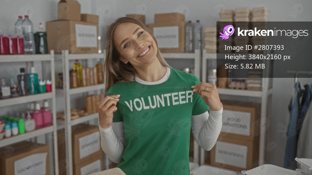 Woman smiling in donation center wearing volunteer shirt surrounded by boxes and supplies indoors at charity location capturing positive and helpful atmosphere through her expression - Kraken Images