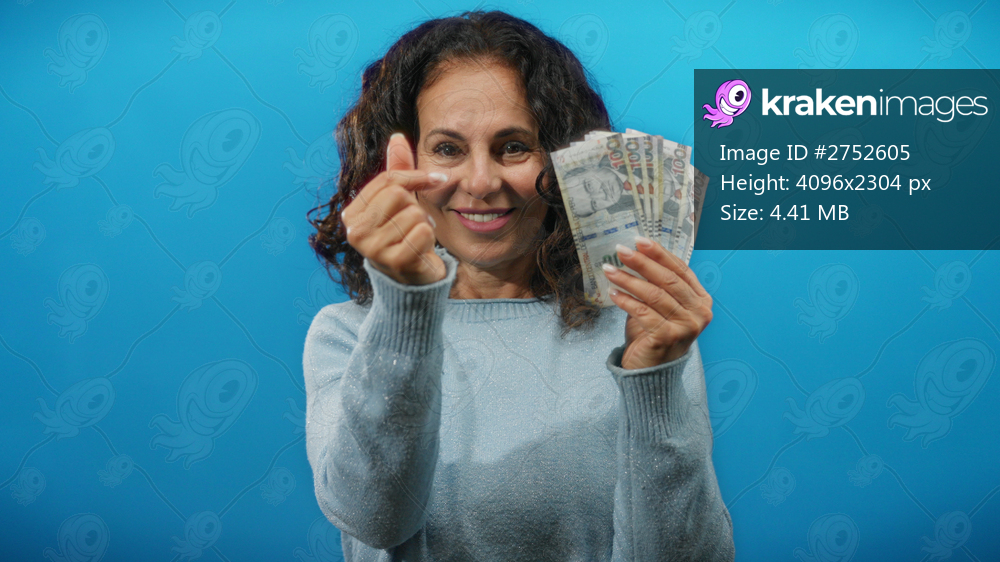 Woman smiling in front of a blue background holds peruvian banknotes displaying a heart gesture with her fingers, embodying a concept of wealth and happiness. - Kraken Images