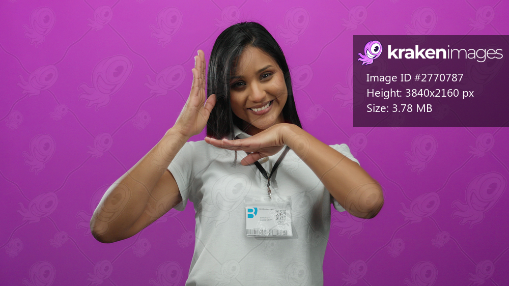 Woman smiling in front of a vibrant pink wall, exuding confidence with a badge around her neck, embodying energy and positivity.