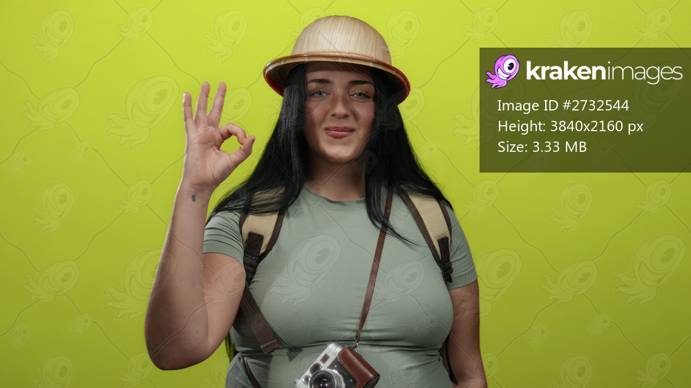 Woman smiling in front of a vibrant yellow background, wearing a safari hat and backpack with a vintage camera, making an okay gesture, portraying adventure and exploration. - Kraken Images