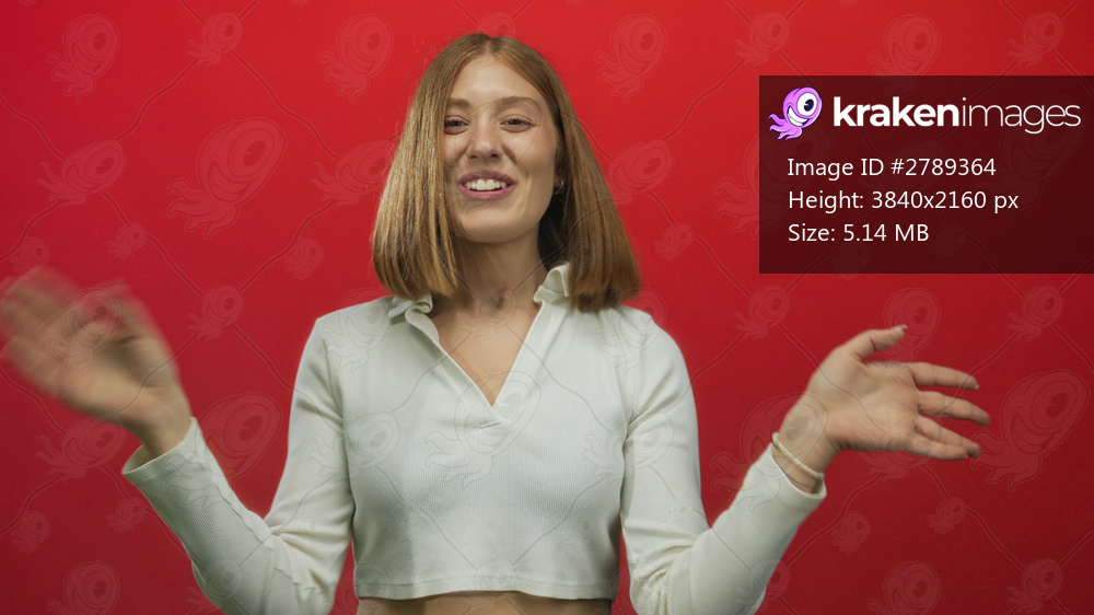 Woman smiling in front of an isolated red wall with a playful expression and blonde hair, wearing a white top, conveys joy and energy in a vibrant, studio setting. - Kraken Images