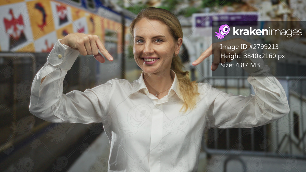 Woman smiling in front of blurred train station background wearing a white shirt and pointing at herself, conveying confidence and joy, outdoors and daytime setting. - Kraken Images