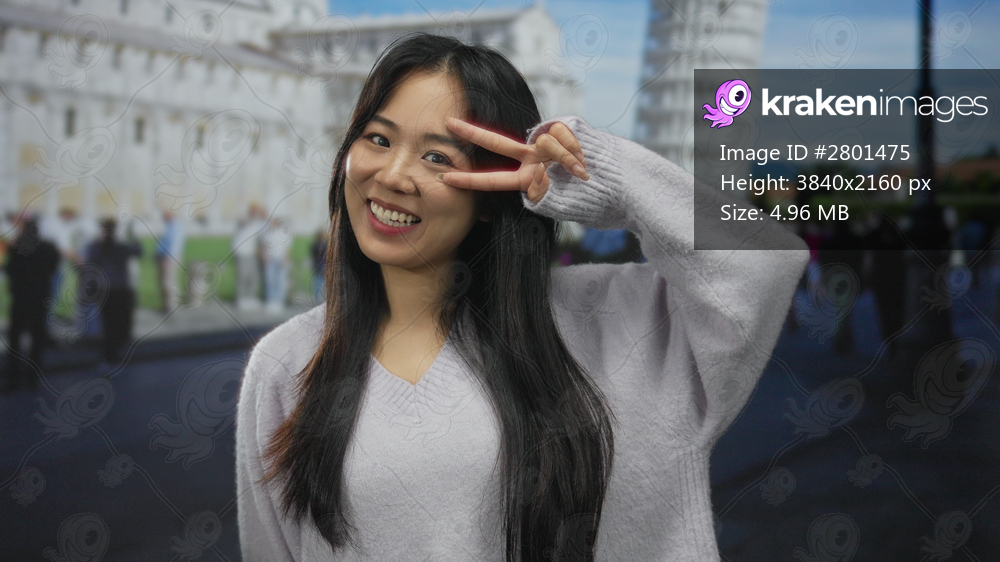 Woman smiling in front of pisa tower outdoors in italy with long hair wearing sweater making peace sign with hand gesture under sunny sky.
