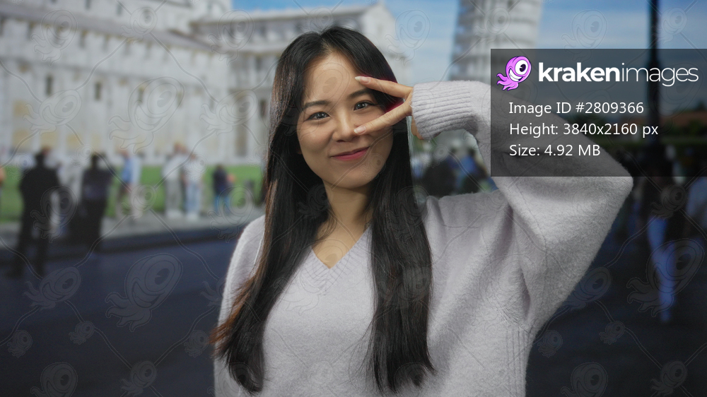 Woman smiling in front of pisa tower outdoors in italy with long hair wearing sweater making peace sign with hand gesture under sunny sky.