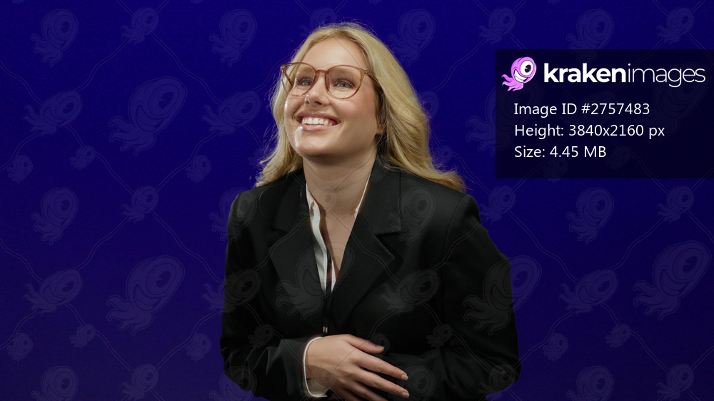 Woman smiling in glasses and black business suit against a vivid blue background suggests professionalism and confidence.