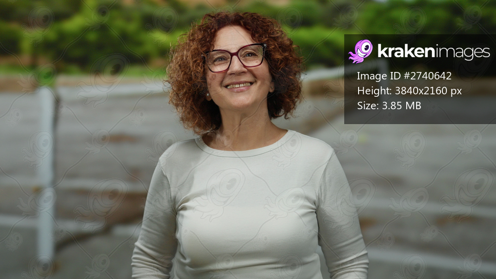 Woman smiling in glasses standing outdoors on tennis court with blurred background, wearing white shirt, showcasing middle age happiness and casual lifestyle. - Kraken Images