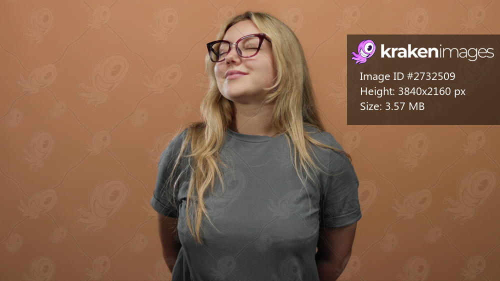 Woman smiling in glasses stands before a warm-toned background with a relaxed expression, showcasing confidence and serenity in a simple, casual setting. - Kraken Images