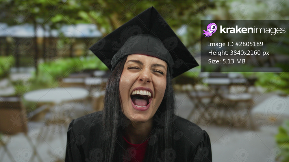 Woman smiling in graduation cap and gown at an outdoor terrace cafe surrounded by trees, celebrating her achievement with a joyful expression.