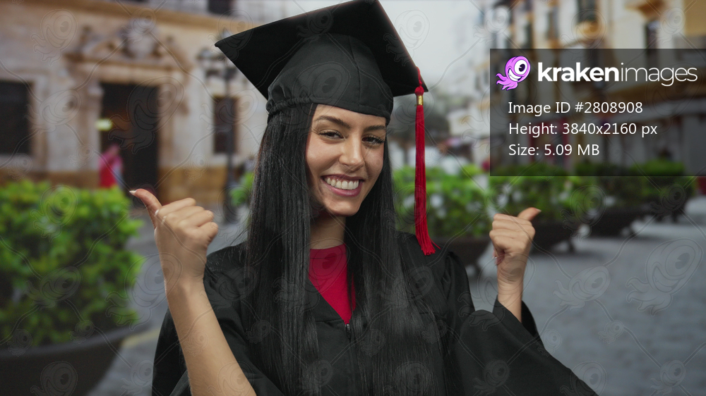 Woman smiling in graduation cap and gown on a vibrant city street celebrating her achievement outdoors.