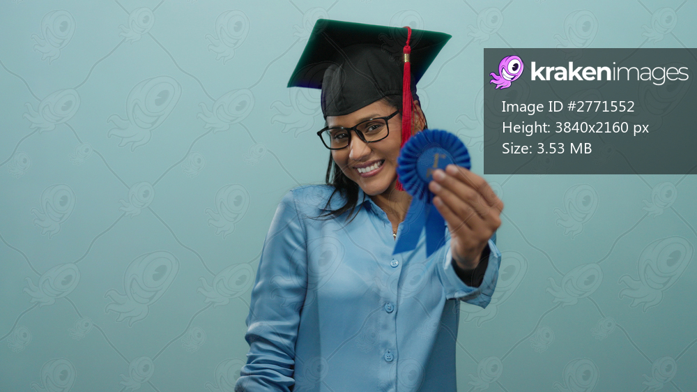 Woman smiling in graduation cap holding blue ribbon in front of blue background representing academic achievement with a confident demeanor.