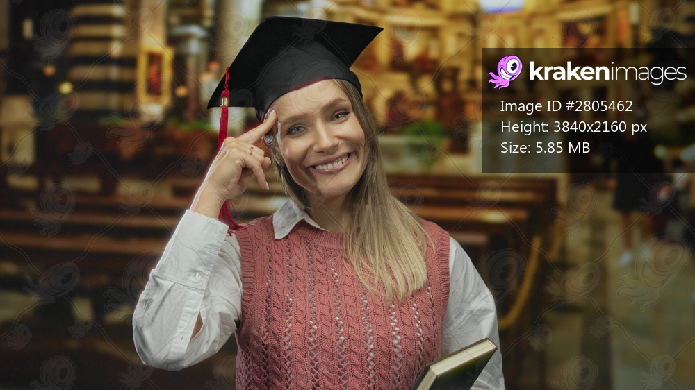 Woman smiling in graduation cap holding book in church setting, signifying academic achievement and contemplation.