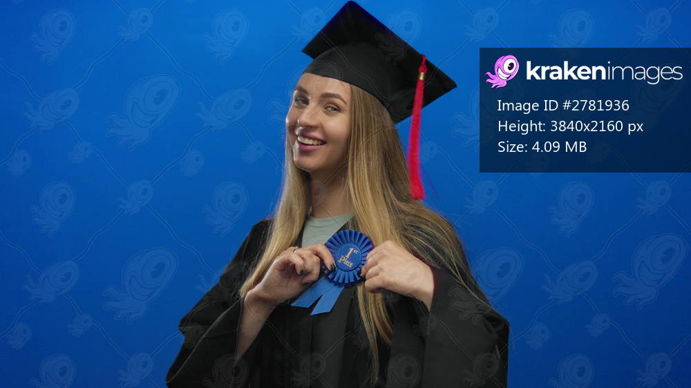 Woman smiling in graduation gown holding first place ribbon against blue wall symbolizing achievement and future, showcasing happiness and success in an isolated academic setting. - Kraken Images