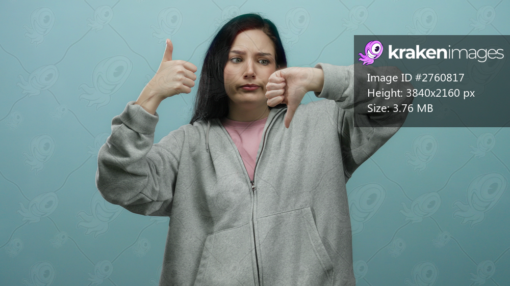 Woman smiling in gray hoodie gives thumbs up and down against blue background illustrating mixed emotions.