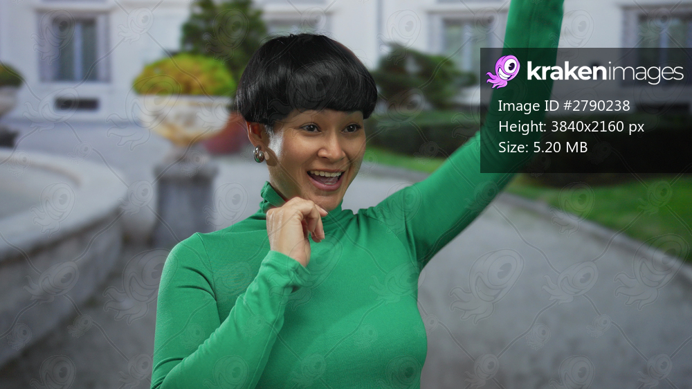 Woman smiling in green sweater gesturing animatedly in outdoor urban street city setting with lush greenery and classic architecture in the background. - Kraken Images