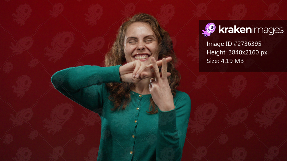 Woman smiling in green sweater makes hashtag gesture on red background conveying modern communication and social media interaction.