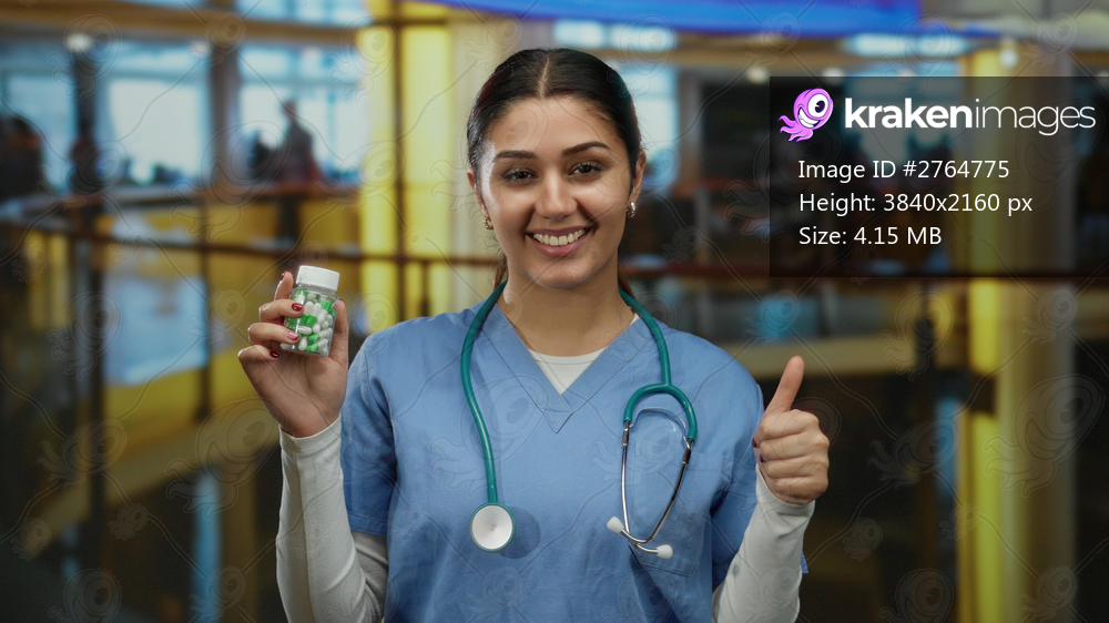 Woman smiling in hotel lobby wearing scrubs and stethoscope holding pill bottle with thumbs up.