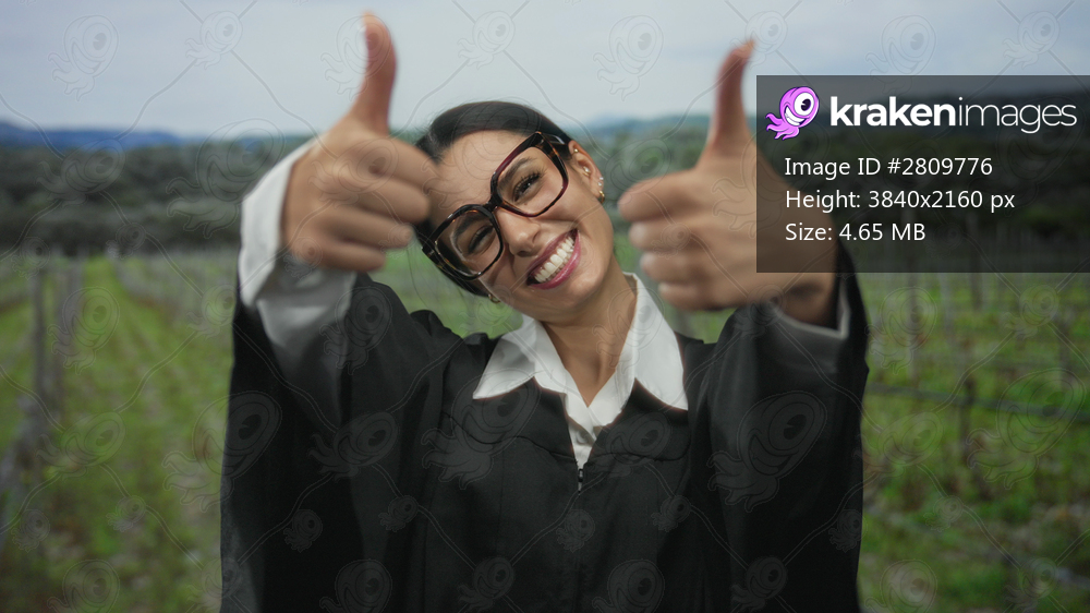 Woman smiling in judge uniform giving thumbs up in a scenic park, embodying happiness and professionalism in an outdoor setting with vibrant green background. - Kraken Images