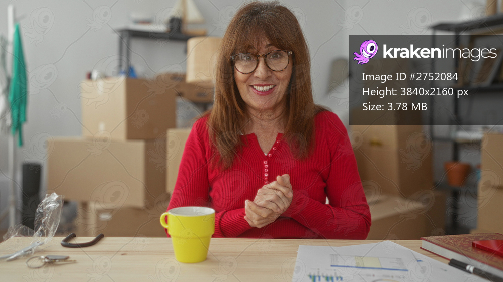 Woman smiling in living room with moving boxes and coffee cup on table, showcasing excitement in new home setting, hispanic senior surrounded by unpacked belongings. - Kraken Images