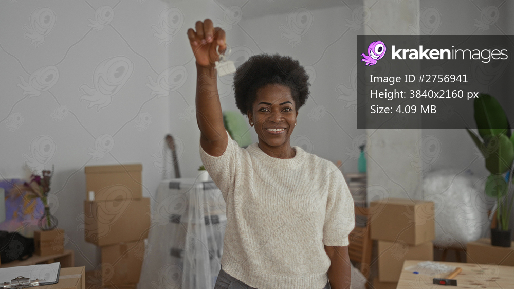 Woman smiling in new home holding keys surrounded by moving boxes in a cozy living room with plants and unpacked items, celebrating homeownership.