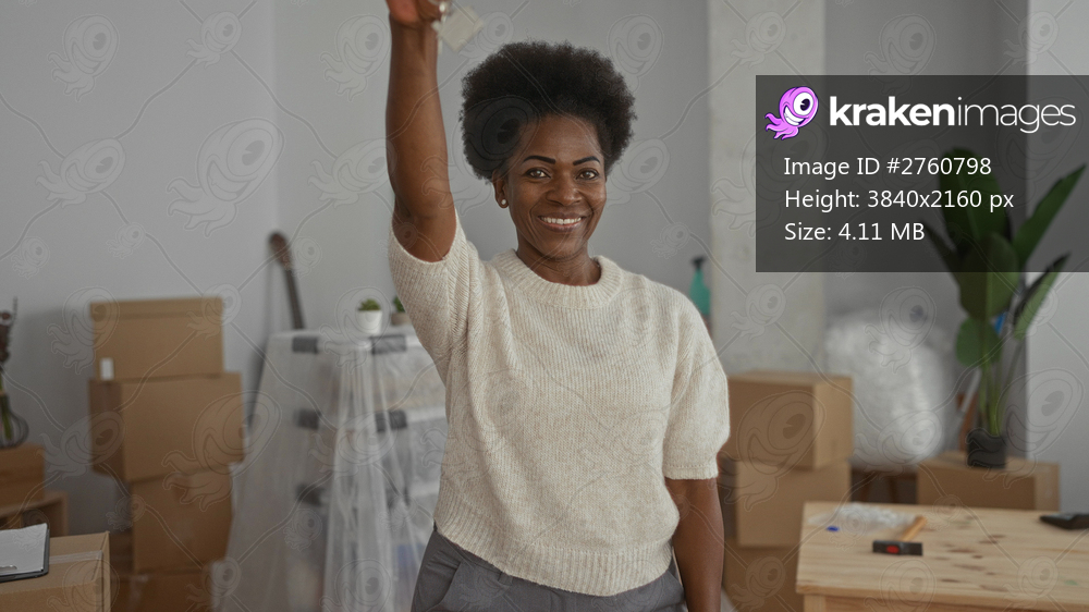 Woman smiling in new home holding keys surrounded by moving boxes in a cozy living room with plants and unpacked items, celebrating homeownership.