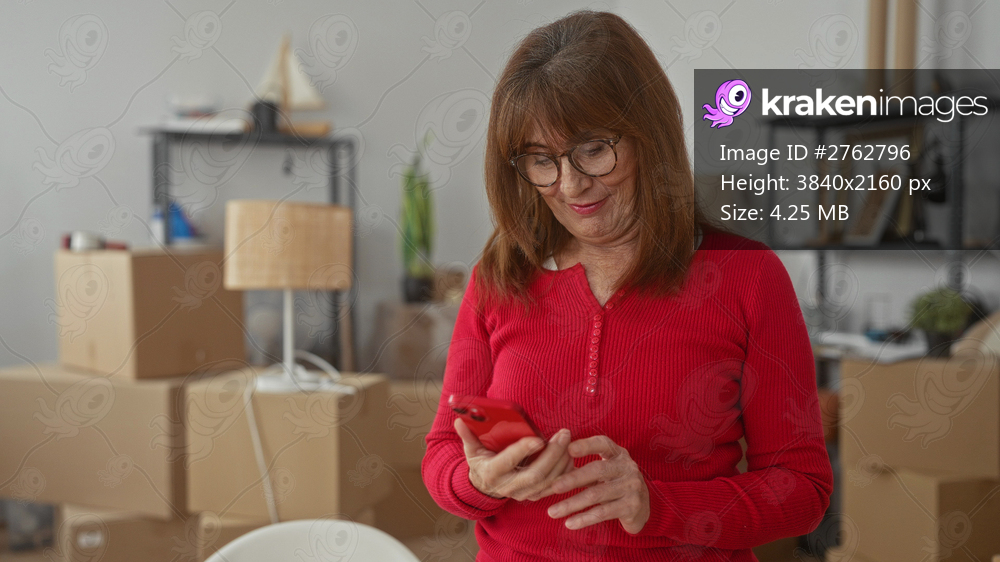 Woman smiling in new home living room with moving boxes, phone in hand, red sweater, unpacking, bright space, feeling happy, light interior, modern decor, wooden shelves. - Kraken Images
