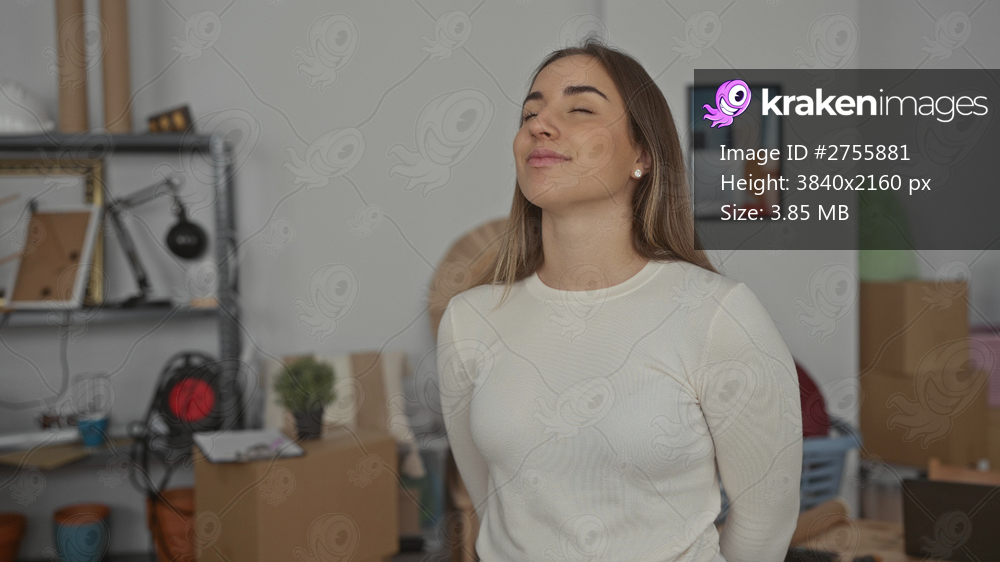 Woman smiling in new home surrounded by boxes and decor, enjoying a fresh start with a sense of accomplishment, bright indoor setting enhances the joyful atmosphere. - Kraken Images