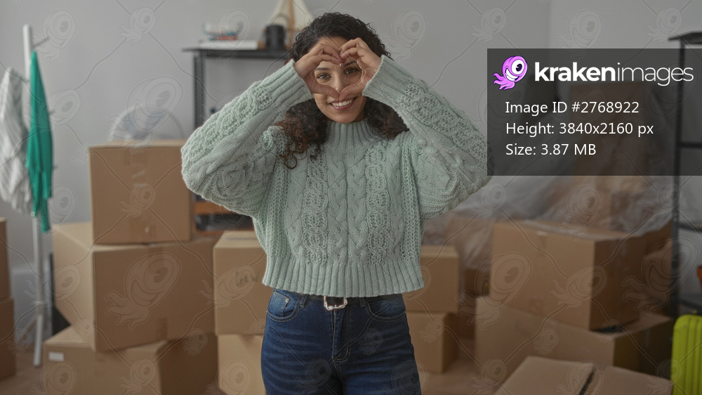 Woman smiling in new home surrounded by moving boxes making heart shape with hands wearing sweater in living room