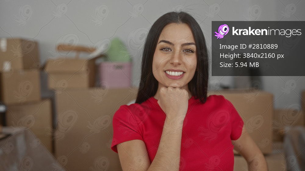 Woman smiling in new home surrounded by moving boxes, wearing red shirt, signifying joy and fresh beginnings in modern living room setting.