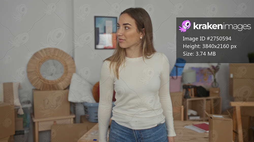 Woman smiling in new home with unpacked boxes reflects comfort and excitement creating a welcoming environment indoors.