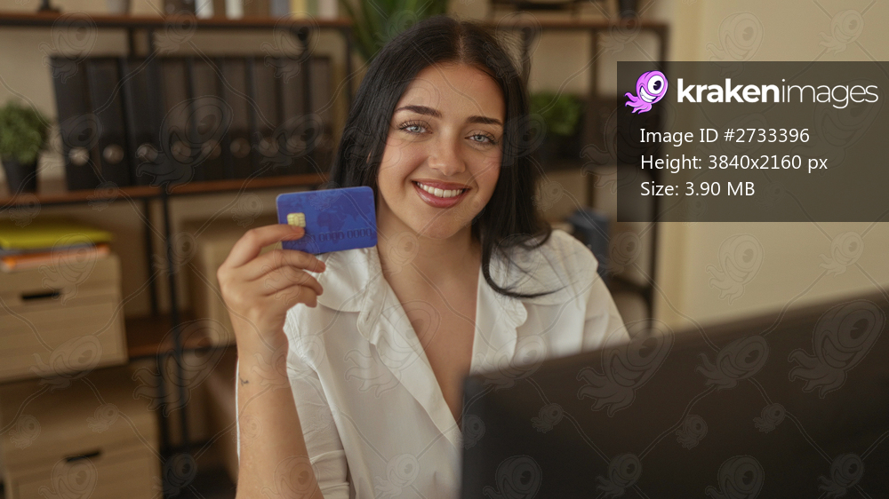 Woman smiling in office holding a credit card, sitting at desk with computer, surrounded by bookshelves and organized files, conveys a sense of digital commerce readiness. - Kraken Images