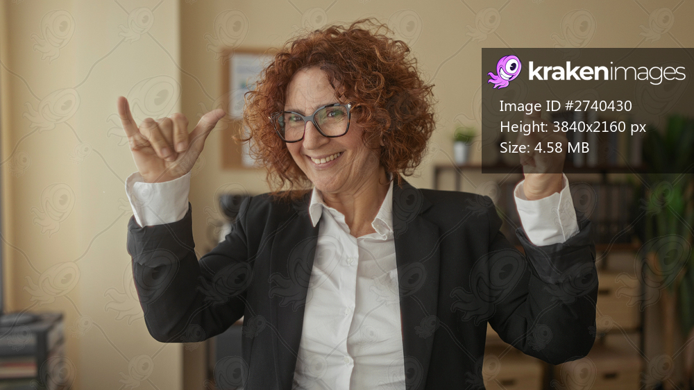 Woman smiling in office wearing glasses and black suit with curly hair and bookshelf in background showing a positive expression indoors with paperwork and plants visible. - Kraken Images
