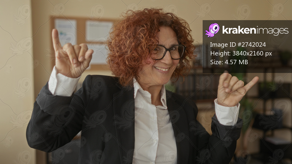 Woman smiling in office wearing glasses and black suit with curly hair and bookshelf in background showing a positive expression indoors with paperwork and plants visible. - Kraken Images